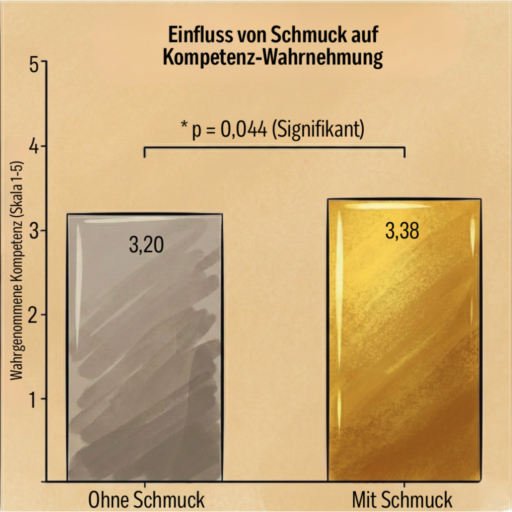 Der Kompetenz-Vorteil in Zahlen: Der goldene Balken zeigt den signifikanten Anstieg der wahrgenommenen Kompetenz, sobald Schmuck getragen wird. Visualisierung in Anlehnung an die Studienergebnisse von Klatt et al. (2016).